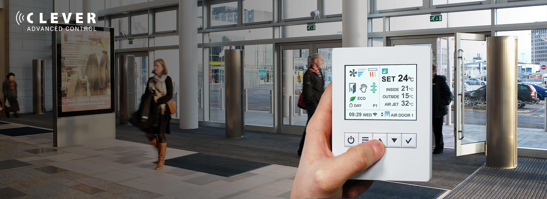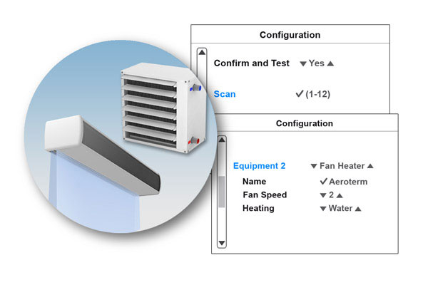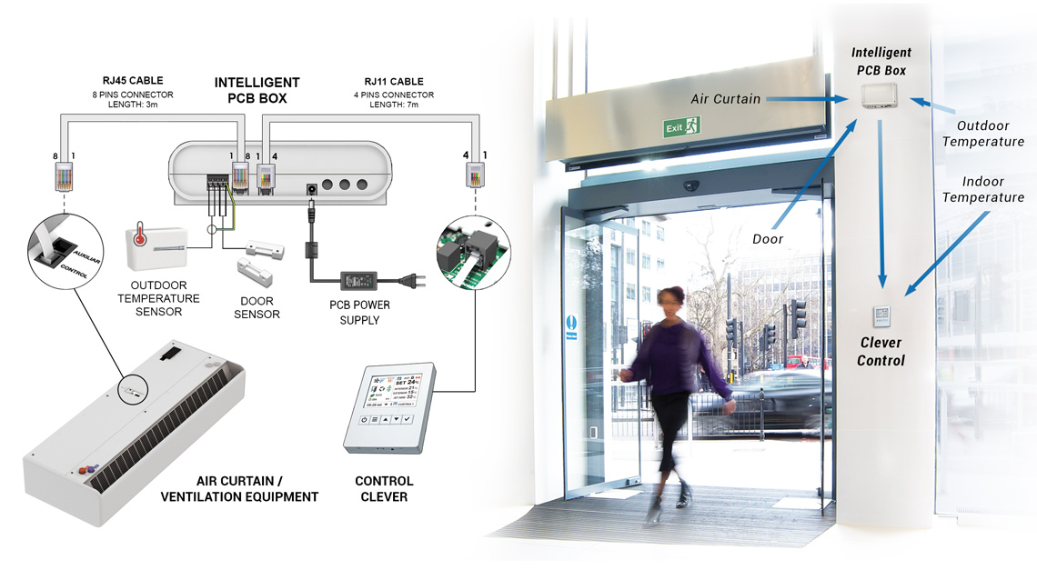 Vairāku Aprīkojumu KontroleCLEVER PCB Vadība var kontrolēt dažādus ierīču veidus: gaisa aizkarus, sildītājus, AHU un citas sistēmas. 1 CLEVER TFT var vadit līdz 255 dažādām ierīcēm, katru ar savu programmu.