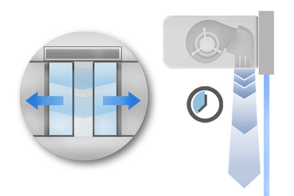 Pielāgojama Durvju AiztureDurvīm aizveroties gaisa aizkari noteiktu laiku turpina strādāt atvērtu durvju režīmā, lai būtu gatavi to atkārtotas atvēršanas gadījumam.