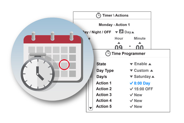 Laika programmasKalendāra funkcija automātiskai ierīces ieslēgšanai/izslēgšanai atkarībā no nedēļas dienas. Lietotājs var izvēlēties starp dienas un nakts režīmiem ar 2 dažādām iestatītām temperatūrām.