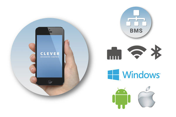 BMS savienojamība un kontrole caur aplikācijuCLEVER var pieslēgties tieši pie BMS Madbus RTU sistēmas. Turklāt, jebkāda Windows, Android un IOS ierīce var vadīt aprīkojumu ar tām pašām funkcijām, ko var vadīt arī CLEVER Vadība.